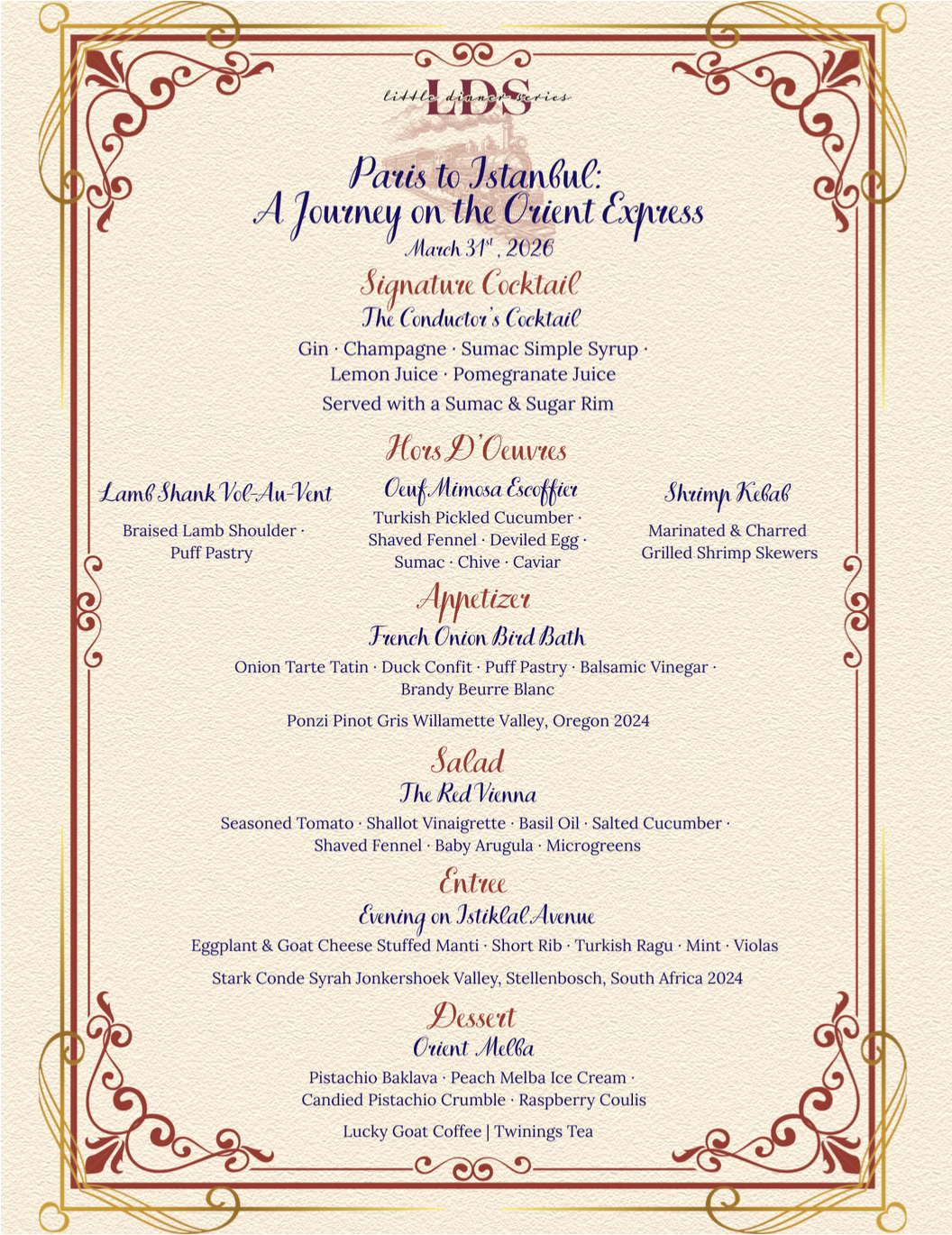 To ensure a safe and enjoyable experience for all guests, the Little Dinner Series enforces a strict policy regarding alcohol consumption. Our staff reserves the right to decline service of alcoholic beverages to any guest who appears intoxicated or impaired, regardless of age.